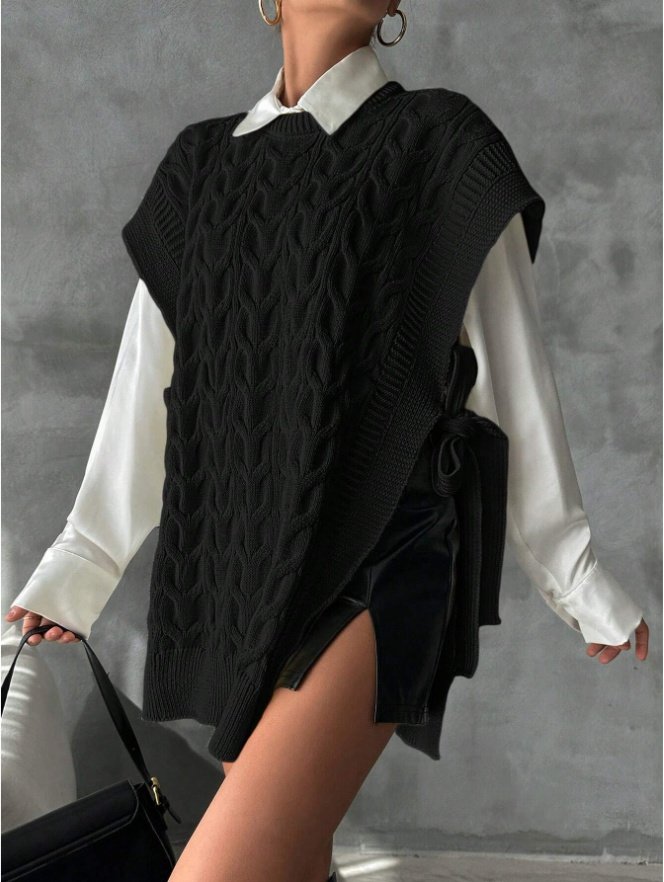 Características principales • Tipo de prenda: Chaleco tipo poncho • Corte: Abierto, sin mangas • Escote: V profundo • Detalles: Lazos laterales para ajuste decorativo • Tejido: Poliéster • Color: Según imagen (tonos neutros) • Talla: Talla única (consultar medidas si aplica) • Estilo: Casual / jersey de punto