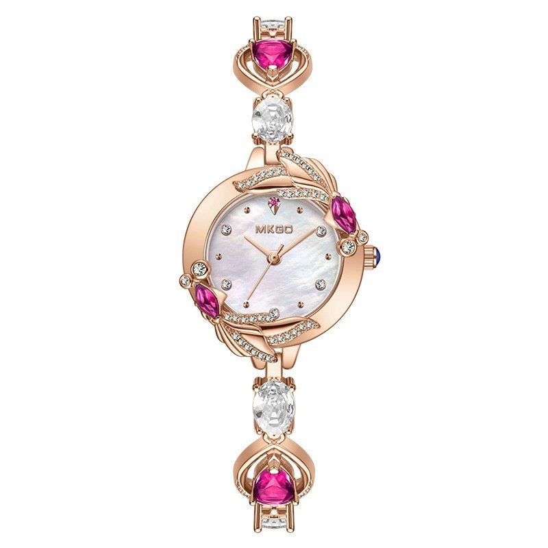 Reloj femenino de estilo casual con diseño decorativo en forma de pececillo dorado y acabado de cristal. Presenta una esfera redonda con fondo tipo nácar y detalles en cristal facetado, acompañada por una correa tipo pulsera con incrustaciones de gemas en tonos azul, verde o rojo según el modelo. El diseño combina carcasa y correa en cobre, con hebilla de latón tipo joyería y cierre ajustable.
