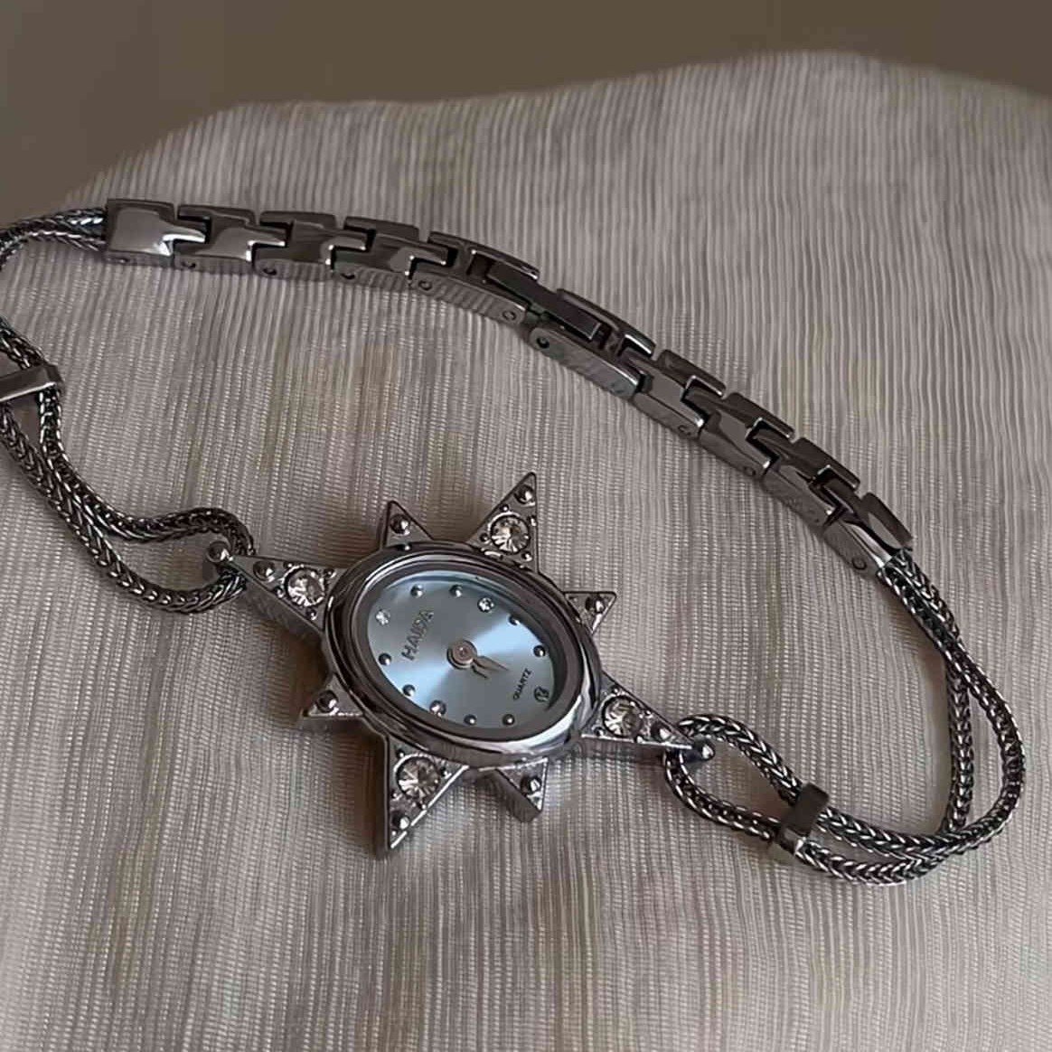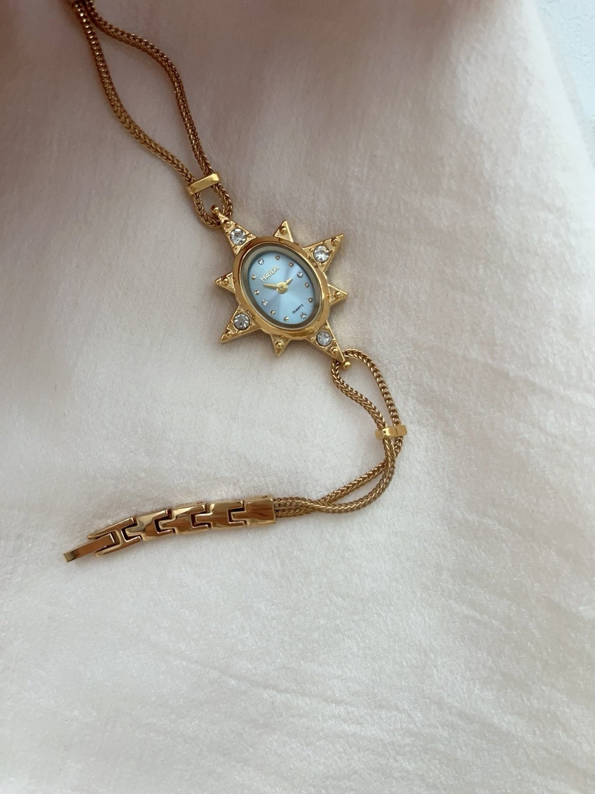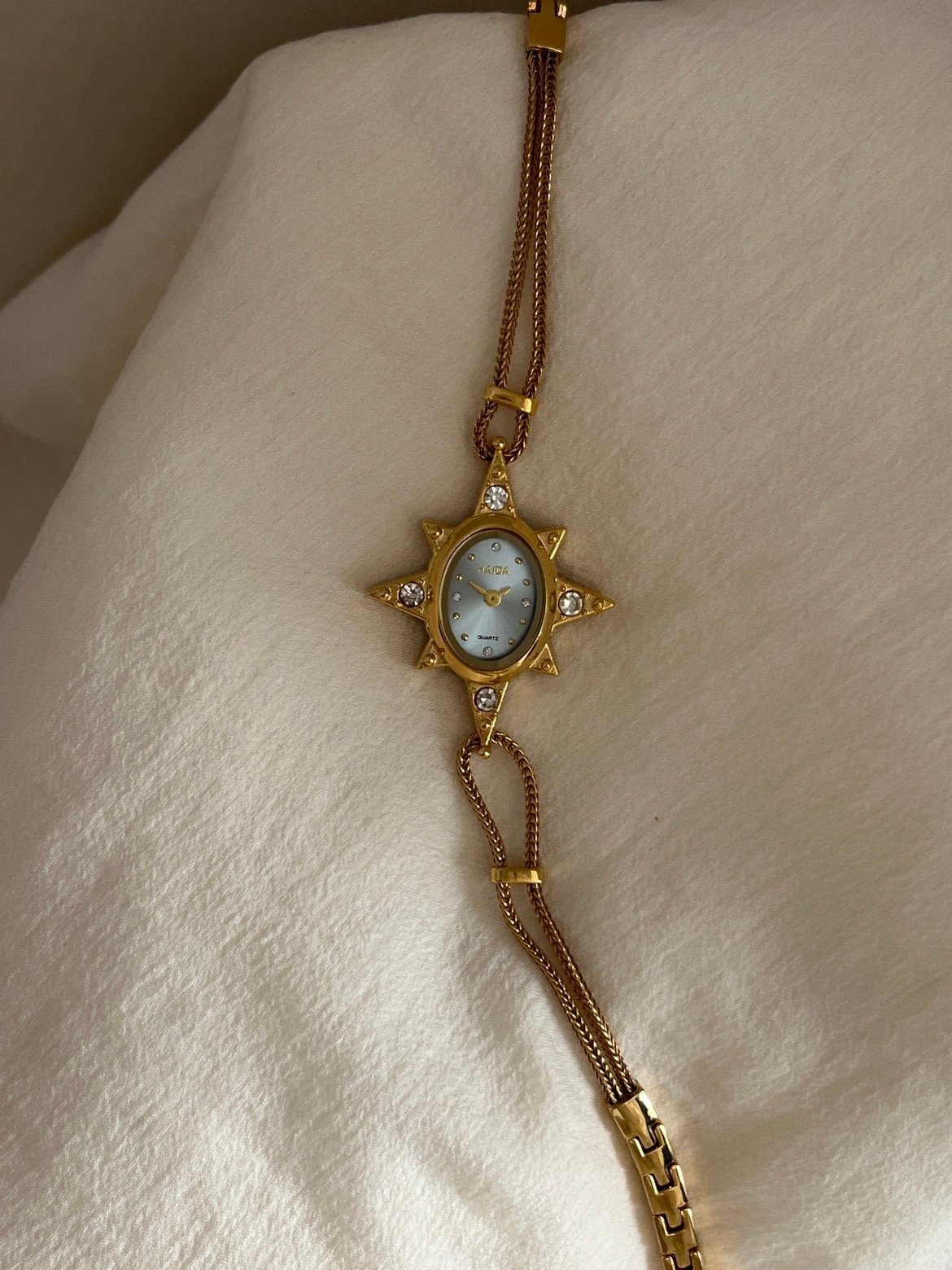 Reloj de pulsera con caja en forma de estrella octogonal dorada, incrustada con pequeños cristales en cada vértice. El dial interior es azul claro brillante, con agujas doradas y marcadores minimalistas. La correa es de metal dorado, pulida y con cierre clásico. El diseño combina estética retro con un aire cómodo, ideal para dar un toque único a looks urbanos o conjuntos elegantes.
