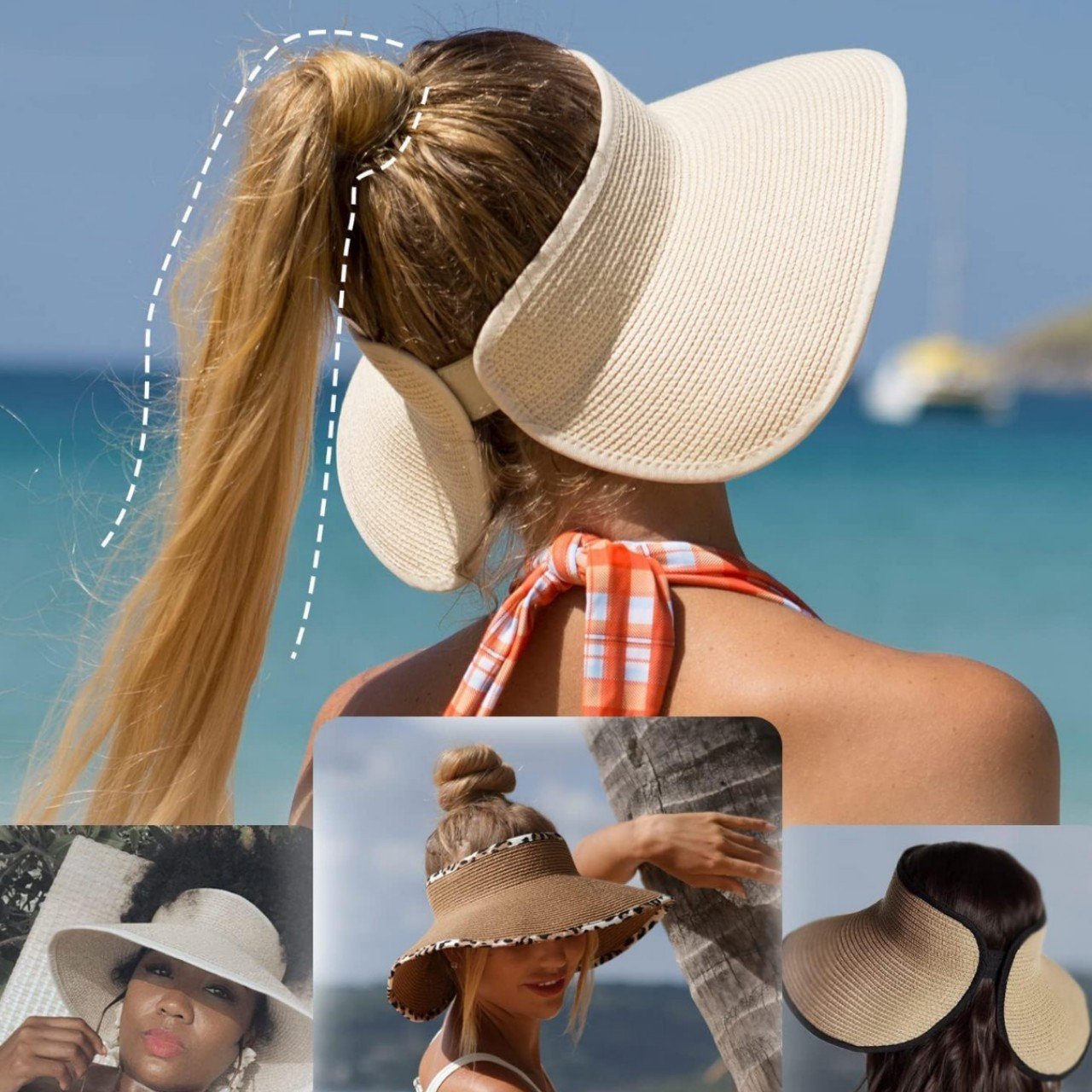 Sombrero de verano confeccionado en material tipo papiro, con diseño de ala ancha envolvente y estructura superior sin corona cerrada para ventilación. El tejido está trabajado con técnica hueca que favorece la transpirabilidad, y el contorno posterior incluye apertura tipo “cola de caballo” para mayor comodidad al recogerse el cabello.