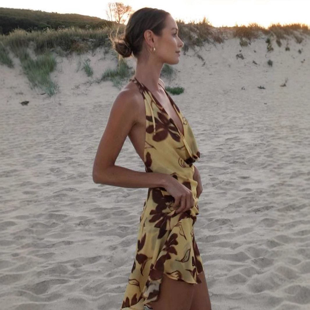 Vestido femenino confeccionado en poliéster ligero, con diseño sin mangas, cuello halter tipo swing y cintura alta ligeramente ajustada que estiliza la silueta sin marcar demasiado. Presenta un estampado abstracto tipo floral en tonos marrón sobre fondo amarillo. Corte fluido, ideal para días cálidos, eventos informales o estilismos veraniegos con personalidad.
